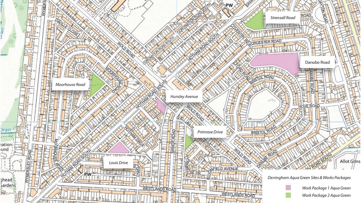 Location plan of the aqua green sites within the Derringham area – Courtesy of Mott MacDonald Bentley