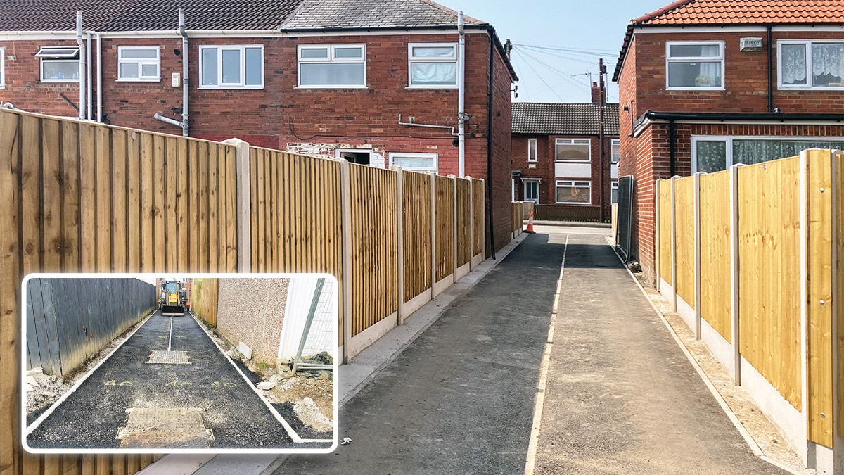 The road access, or ‘10fts’, between properties are lowered to create a channel for stormwater to flow from the highway into the Aqua Green. A headwall and return sewer are installed from the low point of the Aqua Green, connecting into the existing sewer network in the main highway. Flows leave the Aqua Green under gravity, meaning that no mechanical or electrical elements are required for the operation of the solution. The lowering of the 10fts meant that property protection measures were required to the properties adjacent to the 10ft to prevent the solution resulting in them to be at greater risk of flooding. Existing boundary fences were replaced with new fence panels installed on concrete gravel boards to provide a waterproof barrier between the 10ft and the property.