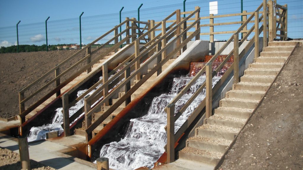 Typically mine water is brought to the top of a cascade structure. Water flows down these steps, which mixes in air. The air encourages the dissolved iron in the water to become solid. The water then flows into lagoons where the iron has time to settle at the bottom for removal and the remaining finer iron particles are filtered out when the water passes through a series of reed beds.