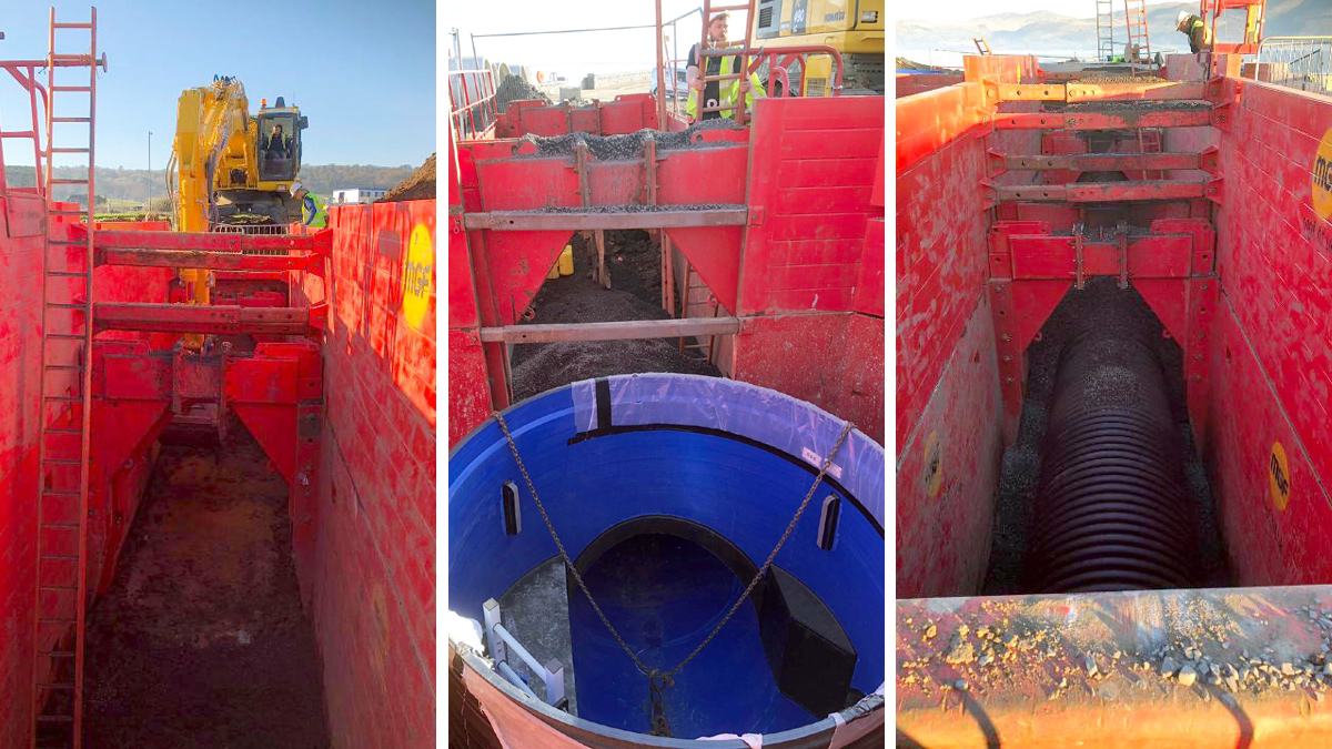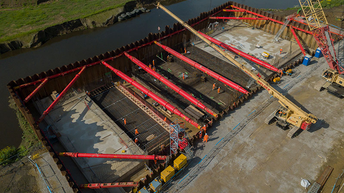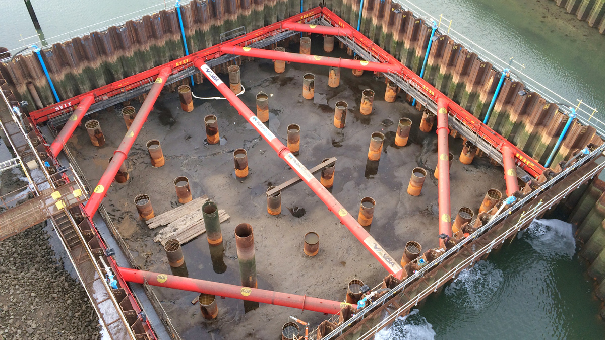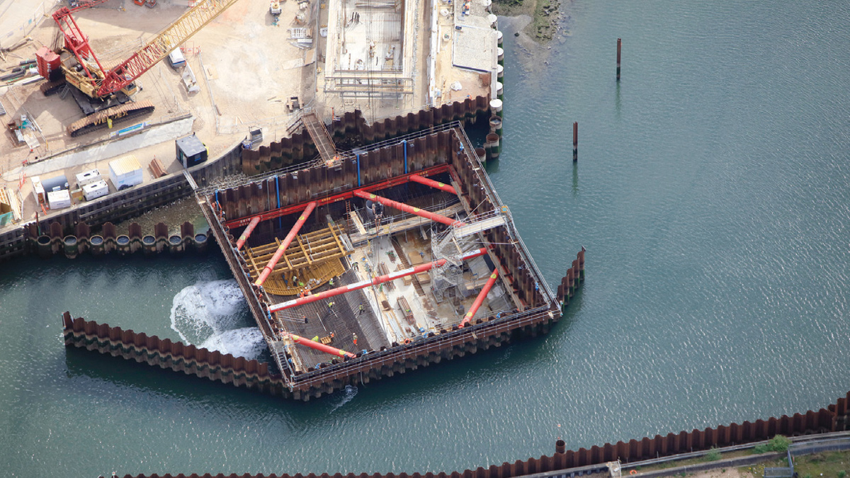 “The cofferdam was an irregular ‘bowtie’ shape following the shape of the wing walls to minimise the amount of excavated material. This created four internal corners that we had to deal with in the framing design. Ordinarily, this would require elements of bespoke manufacture or additional props. However, due to our experience, we were able to devise a solution using a fully modular system. We achieved this by using minimal propping by adopting modular pinned connections at these locations. This solution created vast amounts of open space within the cofferdam making excavation simpler and faster.”