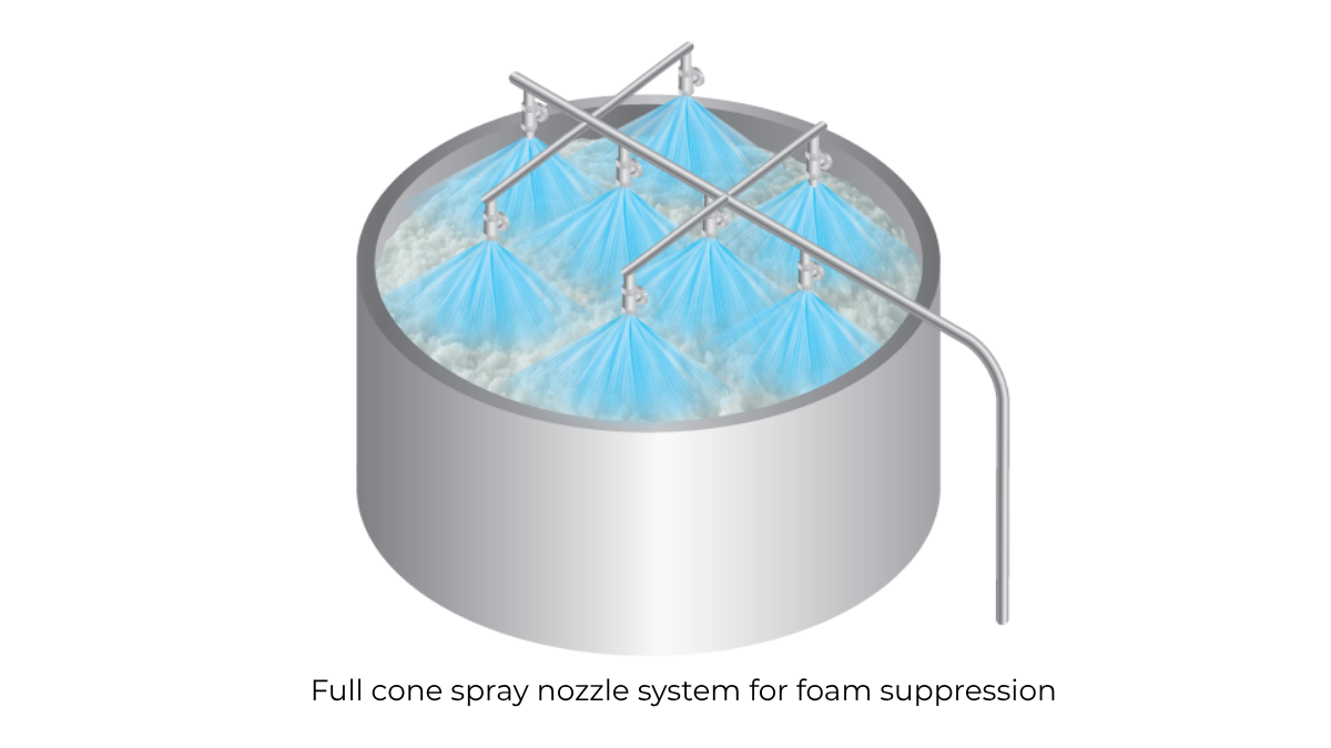 Foam is undesirable because it can overflow vessels, create slippery and unsafe working conditions, interfere with processing, damage materials, and cause tanks to drain and dry slowly. Controlling foam can be accomplished by spraying liquid onto the pool, vessel, or reservoir’s surface and allowing the spray’s droplets to impact the foam bubbles, causing them to break.